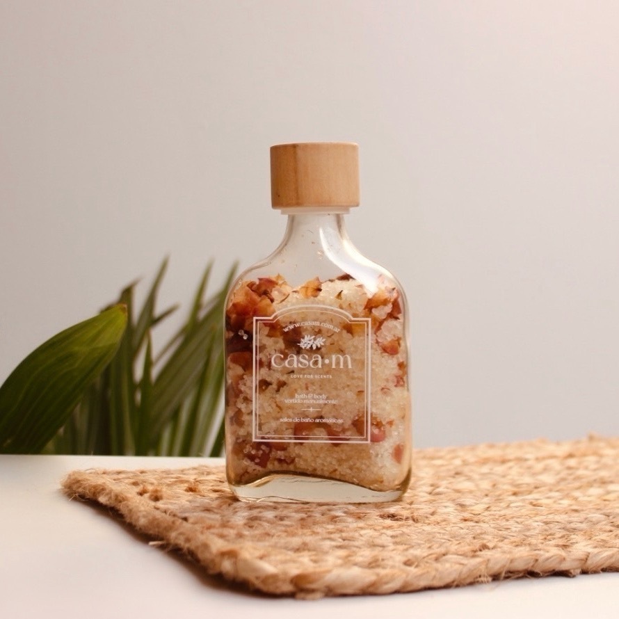 Nuestras sales de baño aromáticas vienen en elegantes botellas de vidrio de 170g con tapa de madera, ofreciendo una experiencia de lujo en tu rutina diaria de bienestar. Disponibles en dos cautivadores aromas: